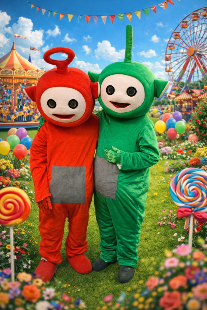 Wij, Dipsy en Po, komen graag vanuit Teletubbieland naar jullie toe. Je kunt ons boeken voor uw bedrijfsfeest, kinderfeest, braderie, verjaardag enz. Prijs is in overleg en reiskosten worden mee verrekend. Wij lenen of verhuren geen pakken zonder onze eigen mensen erin.
